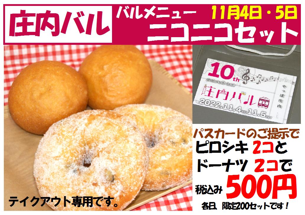 2022年10月27日 庄内バル2022 11月4日(金)、5日(土)の2日間、3年ぶりに庄内バルが開催されます。モンパルナスも初参加させて頂きます。庄内バルのパスカード(前売り500円、当日600円)のご提示で参加各店舗にて500円で超お買い得品の購入や飲食を楽しめます。当店でもテイクアウト専用のニコニコセット(ピロシキ2コ、ドーナツ2コ)やイートイン専用の満足セット(ピロシキ1コ+当日のお勧めパン1コ+ソフトドリンク)の2種類を税込み500円でご用意してお待ちしています。★各日、テイクアウト200、イートイン100の限定数となります。※音バル(街中のあちこちで生演奏)にも参加いたしましたので、4日17時から、5日16時から、各3組の演者が店内で1時間弱の演奏を行います。是非ご来店下さい。