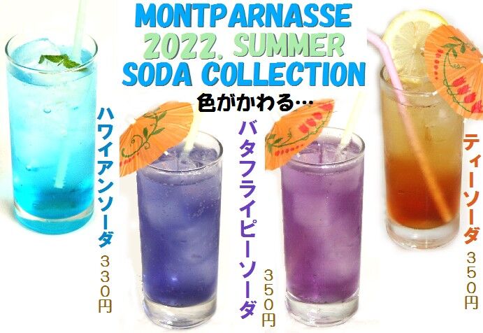 2022年08月01日 2022 SUMMER SODA COLLECTION 猛暑日が続く中、モンパルナスではスッキリ美味しいソーダのラインナップを充実させました。夏の定番ハワイアンソーダ、スッキリテイストのティーソーダ。そして青い花が特徴の東南アジア原産、マメ科植物バタフライピーを使ったソーダ。アントシアニンが豊富で、健康や美容に留意されてる女性に人気のハーブです。何とレモン汁を加えると、色が青から紫へ変化! 是非お試し下さい。甘み控え目な大人のテイストです。