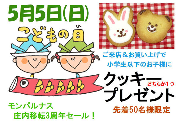2024年05月01日 5月2日より庄内移転3周年セール開催! モンパルナスでは5月2日(木)~7日(火)まで6日間庄内移転3周年セールを開催致します。店頭でお得な割引チケットを配布していますのでお買い得価格にてお買い物をお楽しみ頂けます。5月5日(日)限定で、ご来店&お買い上げで、小学生以下のお子様に特製動物クッキー1点をプレゼント!この機会に是非ご来店下さい。