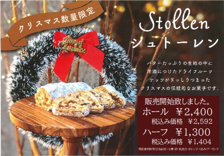 2025年12月01日 シュトーレン販売開始! 2025年12月1日より、クリスマス恒例のモンパルナス特製シュトーレンの販売を始めます。具沢山で本格的なお味を是非お楽しみ下さい。数量限定に付きなくなり次第販売終了です。 カテゴリなしの他の記事 コメント コメントフォーム 名前 コメント 記事の評価 リセット リセット 顔 星 情報を記憶 コメントを投稿する